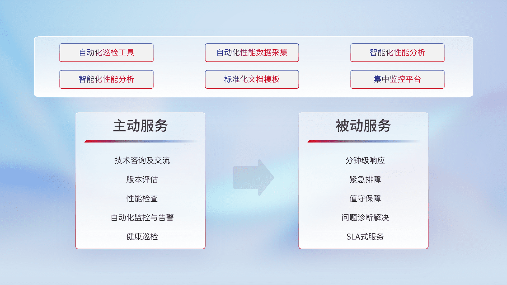 智能化工具和标准化文档,,,保障服务质量,,,,提供主动服务(包含技术咨询、、、、版本评估、、、、性能检查、、、、自动化监控与告警、、、、健康巡检)和被动服务包含(分钟级响应、、紧急排障、、、值守保障、、问题诊断解决、、、SLA服务)。。